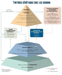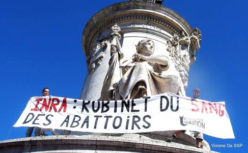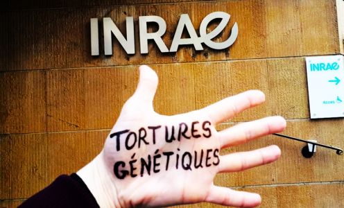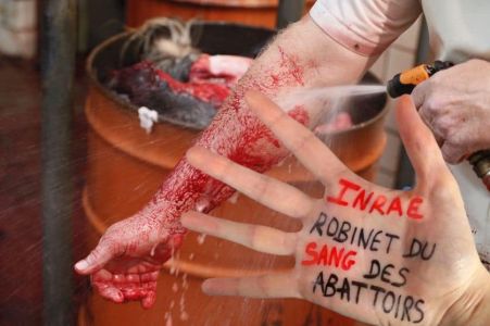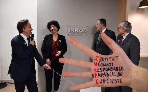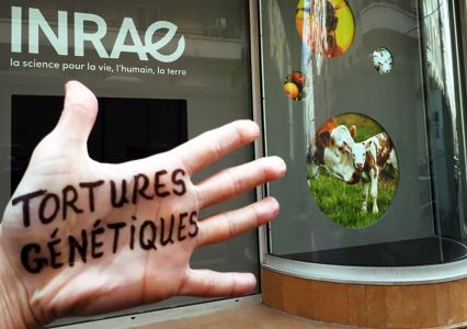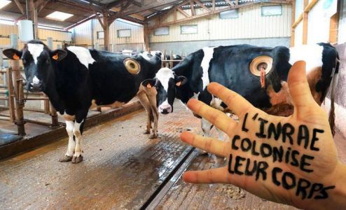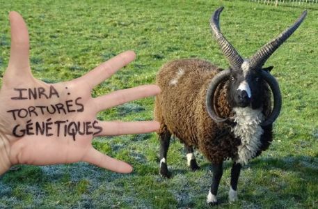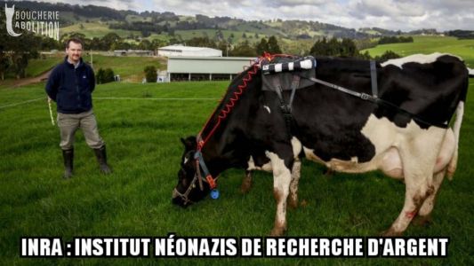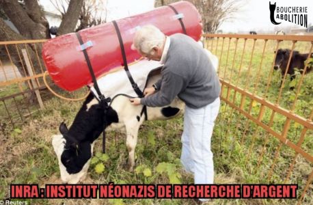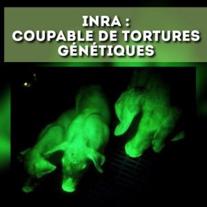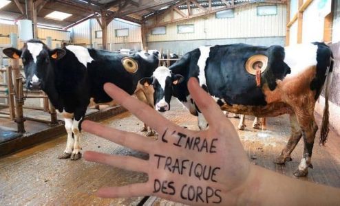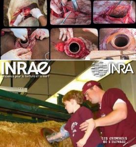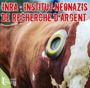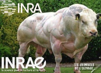 L’INRA est un institut d’Etat au service des multinationales du zoolocauste. L’INRA est coupable de tortures génétiques à l’origine d’épidémies industrielles de naissances par :- programmation sur la prolificité des femelles – usines à viols – programmation de comportements boulimiques .De la vache hublot, à la vache laitiarisée aux tétines raccourcies pour la machine, aux cochons phosphorescents, aux lapins à poils allongés, jusqu’aux truies aux 20 porcelets et 14 tétines, l’INRA est le robinet de la tuerie des abattoirs. L’INRA c’est la science sans conscience qui intervient sur l’intégrité corporelle des individu.es et fait produit d’avalement leurs corps charcutés. L’INRA est coupable du crime de proloficité nataliste, coupable du permagénocide par programmation génocidaire et production industrielle de victimes, coupable par “génie génétique” d’aliéner les comportements visant à l’engraissement. Les zoonimaux sont nesclavagisés génétiquement. Booster la natalité pour la rendre industrielle et intervenir par persécutions génétiques (génotypage, clonage, viol génétique) est une indifférence effroyable aux individues créés pour être malades, une indifférence effroyable aux espèces rendues dégénérées et à leur évolutions intelligentes exterminées à jamais.