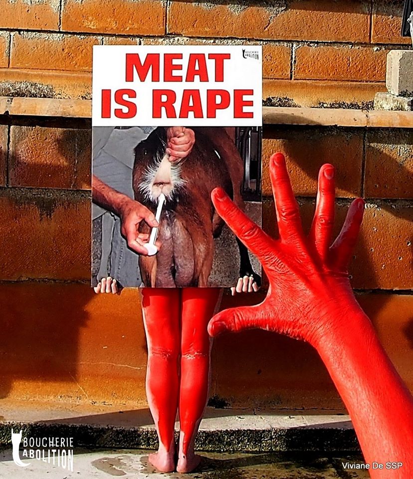 Les femmes et les animaux ne sont pas des territoires de conquête, nos corps ne vous appartiennent pas, nous ne sommes pas des marchandises. Abolissons l’élevage, abolissons la pornoprostitution, détruisons le patriarcat !