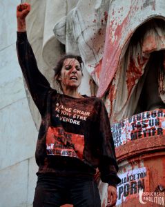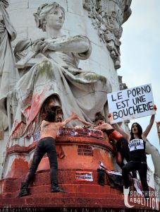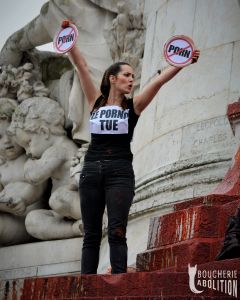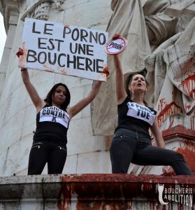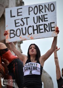 La pørnographie est le spectacle de la prostitution qui est le sexclavage des femmes contraintes de vendre leurs viols et autres persécutions. Il s’agit d’actes de tortures pulvérisant la dignité. L’espace pørnographique est une zone de non-droit où règne l’embrochement des orifices féminins par la fureur masculine. Les viols y sont sériels et perpétuels par la cyberdiffusion des scènes de crimes. Tous les sévices génitaux et les scenari pervers y prospèrent, échappant aux lois du vivre ensemble qui régissent le reste de la société. C’est le purgatoire puritain actualisé dans la vie réelle, l’explosion de crimes racistes, sexistes et spécistes.