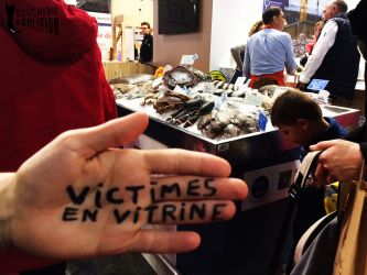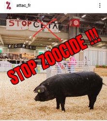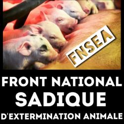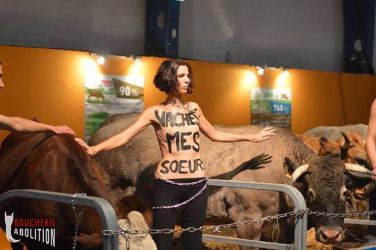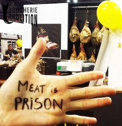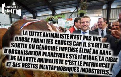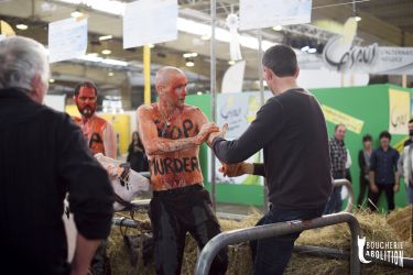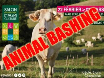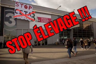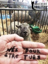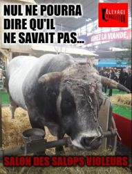 Le « salon » a pour but de montrer au grand public le glamour de l’holocauste, tout en cachant son vrai visage. L’élevage c’est le viol à répétition et à la chaîne, c’est l’avortement et le pompage de sang des juments des fermes à sang, c’est la violence maternelle, physique, génétique et psychique, c’est le désenfantement, le désallaitement, l’asservissement, l’épuisement, l’assassinat. L’élevage c’est le corps transformé en usine, c’est la domination d’autrui, c’est la torture banalisée. L’élevage c’est la haine des autres animaux. L’élevage c’est l’enrichissement des tortionnaires. L’élevage c’est la guerre des humains contre les autres animaux et contre la nature. L’élevage c’est la MORT.