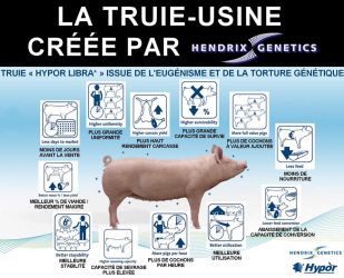 HG a créé, sous la société Hypor, « la truie la plus prolifique au monde » [9]. Cette truie permet aux esclavagistes d’augmenter leurs revenus tout en réduisant leurs dépenses. D’une part, cette truie a besoin de moins d’aliments que les autres, faisant ainsi baisser les coûts d’alimentation qui représentent 60 à 70% des coûts de « production » d’un élevage. D’autre part, cette truie-usine peut mettre au monde plus de 30 porcelets par an, avec un « taux de survie » élevé et des poids uniformes à la naissance. Leur croissance est accélérée, c’est-à-dire que ces cochons peuvent être envoyé·es à l’égorgement 10 jours plus tôt que les autres souches, permettant aux éleveurs de diminuer encore leurs coûts de « production ». La chair de ces cochons serait plus « maigre », de « meilleure qualité », offrant donc un meilleur « rendement carcasse ».
